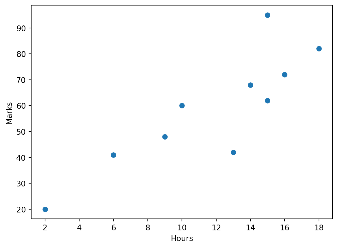 One can customise various parameters in the plot, e.g. to have red markers one could write plt.scatter(hours, marks, color = 'red') (or even color = 'r').