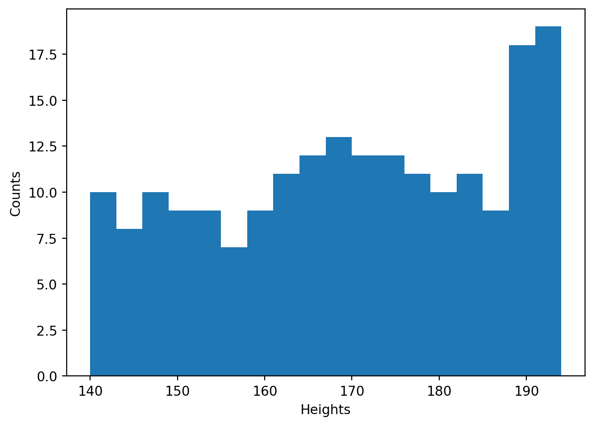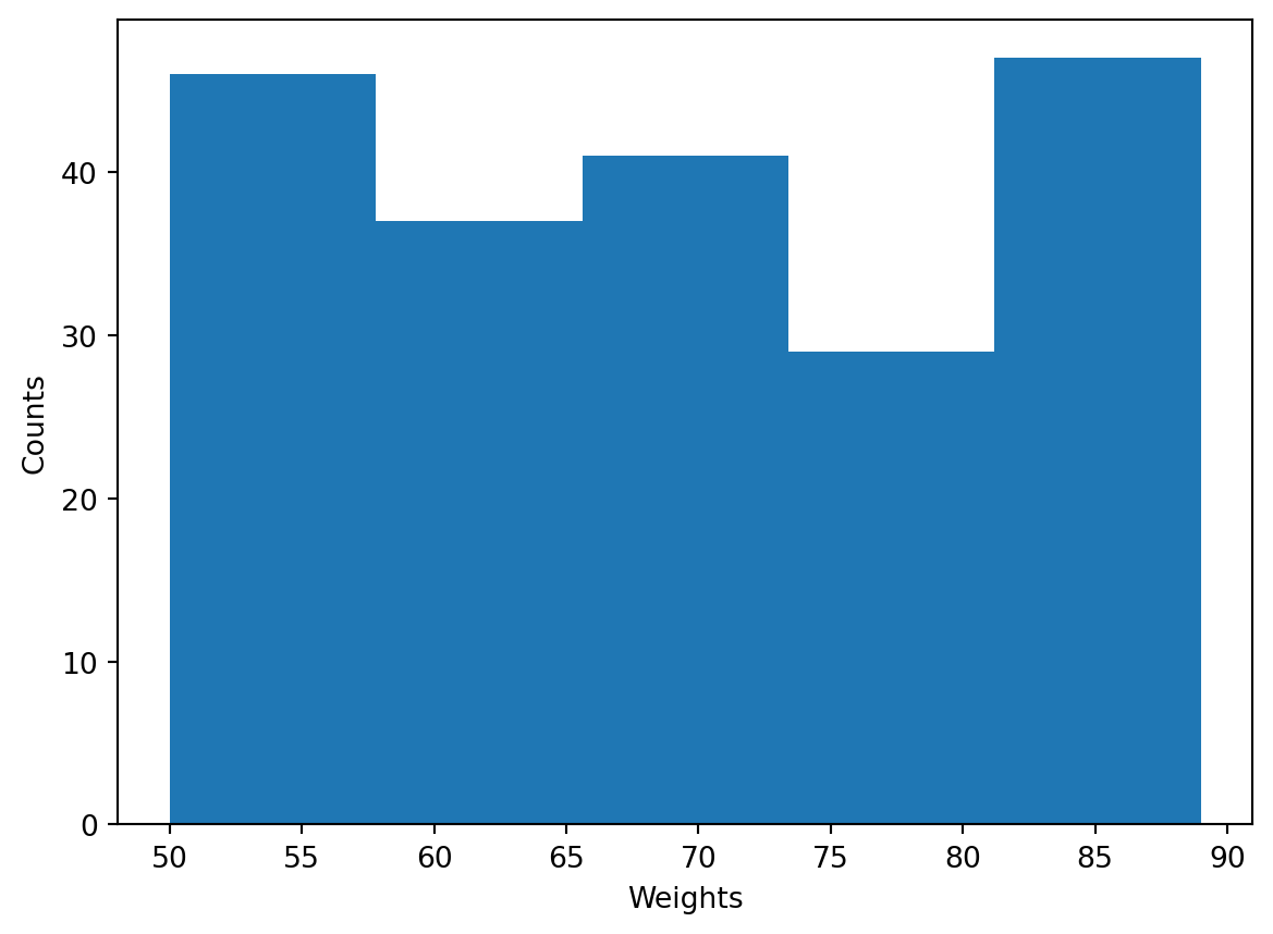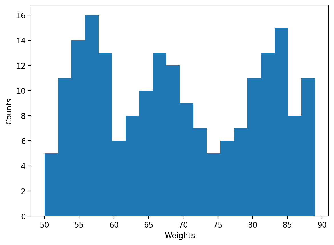 Let’s create the histogram for the weights of all sports club members. Conside the histogram with \(20\) bins.