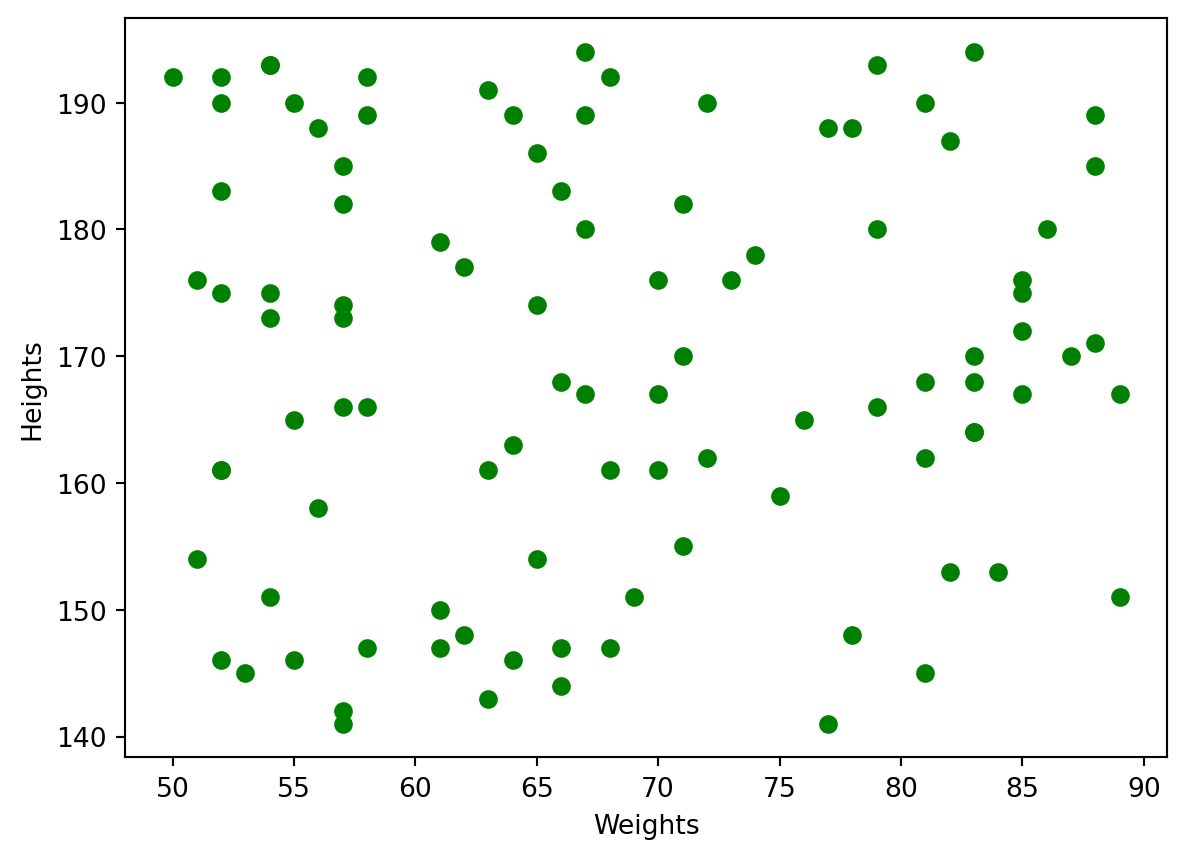 Take the first \(100\) members of the sports club from the sportsclub.csv discussed before, and draw the scatter plot of heights (vertical axis) over weights (horizontal axis). Use green colours for the markers. Label the axes appropriately.