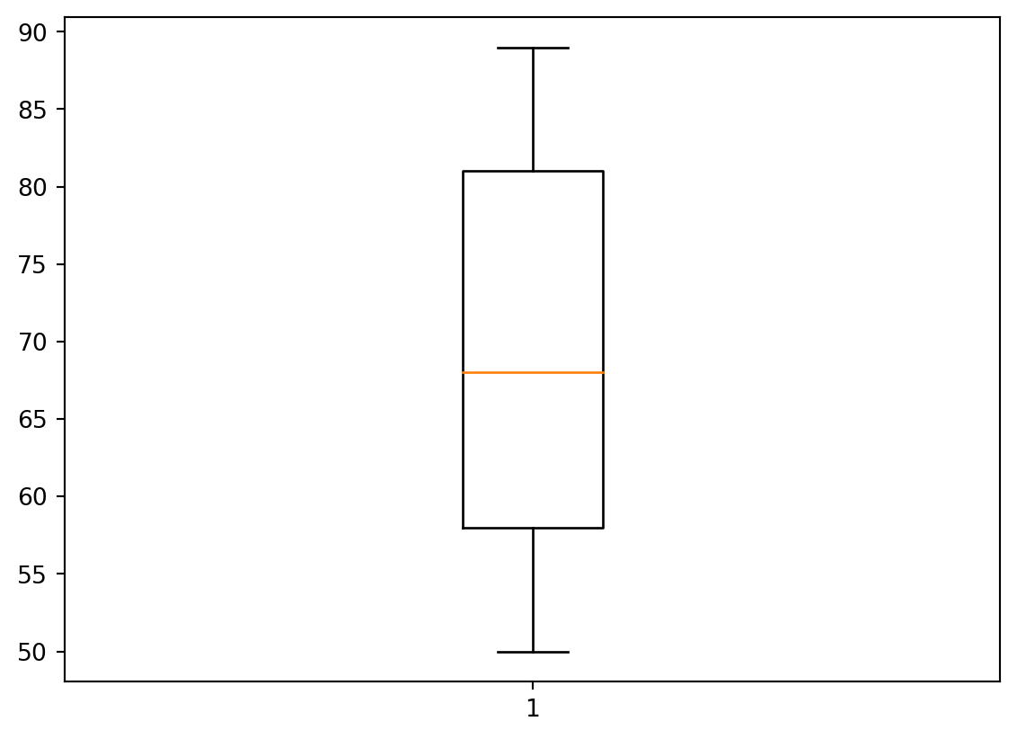 Remark. Recall that the box plot visualises, in particular, the rectangle bound by the lower and upper quartiles: \(Q_1\) and \(Q_3\), whereas the coloured line represents the median \(Q_2\). We know that \(Q_2\) is calculated differently if the sample has even or odd number of elements. By definition, recall, \(Q_1\) and \(Q_3\) are medians of the lower half and upper halves of the ordered sample. However, it’s a question of agreement whether to include the median \(Q_2\) to both halves or not, in the case when the number of elelements is odd. For example, let the data be \[ 1,2,3,4,5,6,7. \] The median is \(4\), i.e. \(Q_2=4\). Now, we may say that the lower half is \(1,2,3\), its median is \(2\), i.e. \(Q_1=2\), similarly then the upper half is \(5,6,7\), hence, \(Q_3=6\). Another approach is to say that the lower part is \(1,2,3,4\) (including \(Q_2=4\)), and it’s median is \(\frac{2+3}{2}=2.5\), i.e. \(Q_1=2.5\); similarly then the upper half is \(4,5,6,7\), and hence, \(Q_3=5.5\). Python in Mathplotlib uses the second approach.