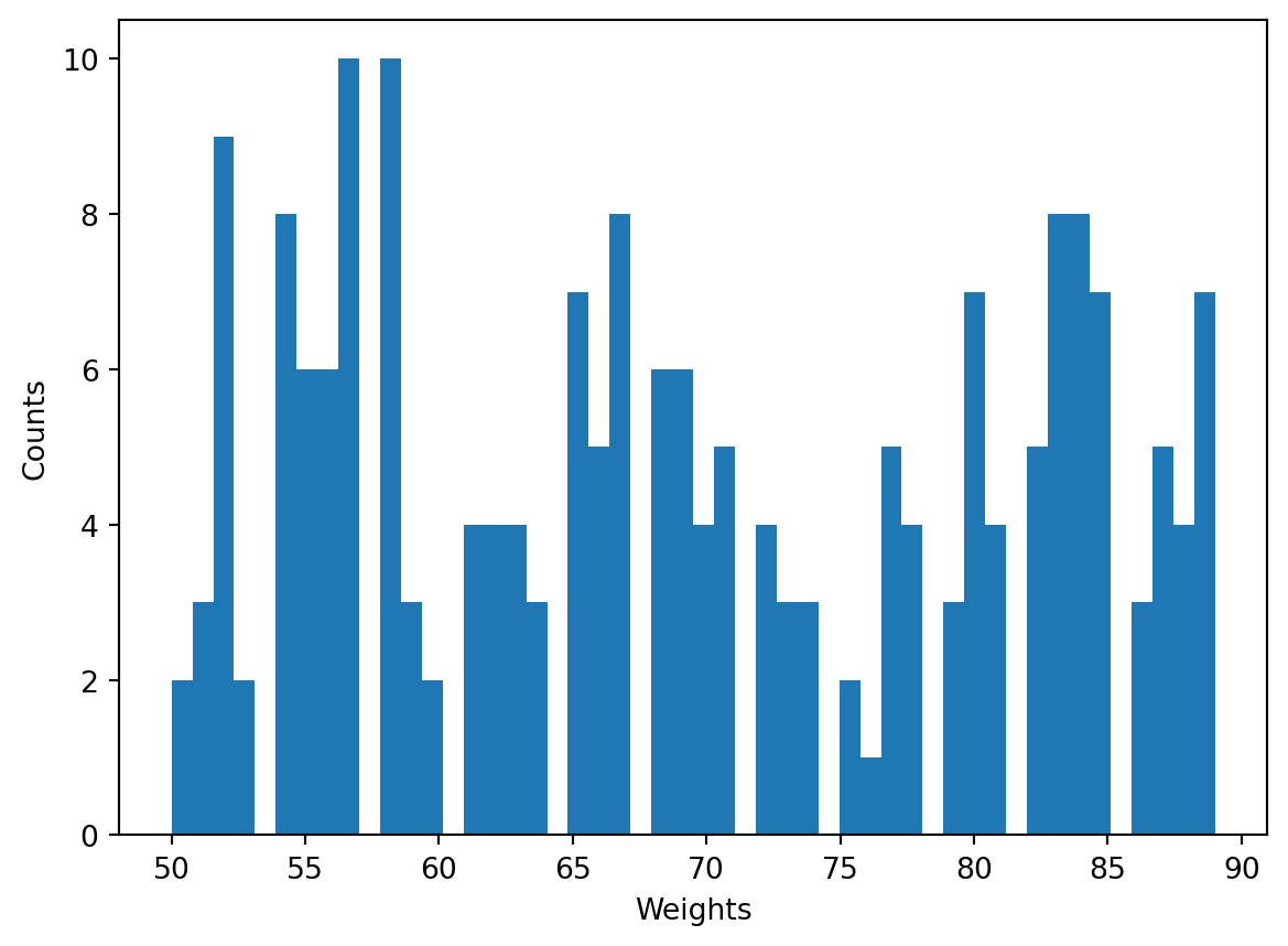 Let’s create the histogram for the weights of all sports club members. Conside the histogram with \(20\) bins.