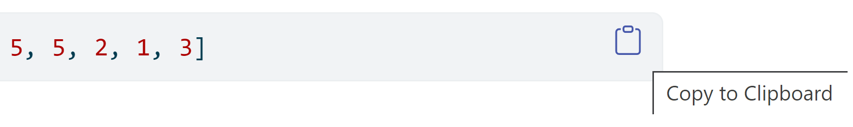 a = [2, 1, 3, 4, 2, 6, 4, 0, 1, 1, 3, 3, 4, 1, 1, 5, 5, 2, 1, 3]This is a bit tedious precedure, and if you start to re-type this in your https://anaconda.com/app Jupyter Notebook you may make a mistake. It may be better to copy the previous line of the code and paste into the notebook. To copy it, you may e.g. hover the mouse above the right end of the grey area with code and click the appeared icon: