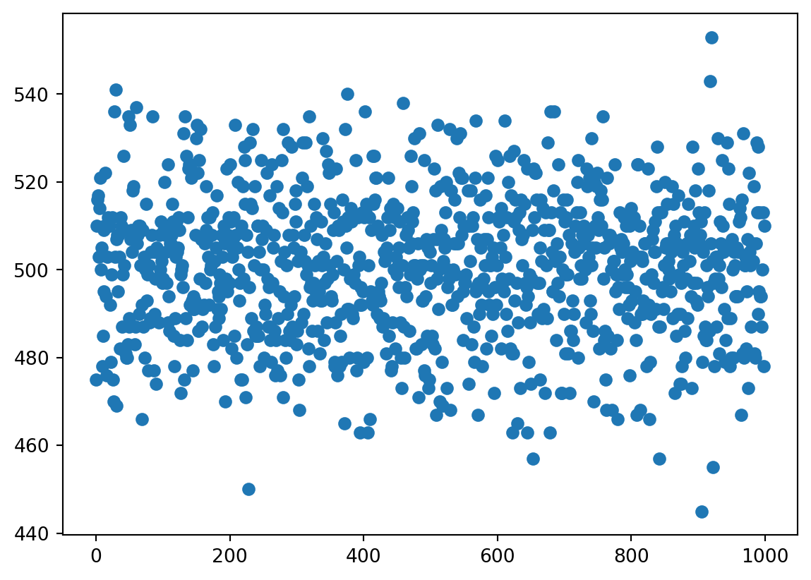 As you can see all results indeed gather around 500. Note that you can find min(heads) and max(heads) to see how large is the spread of numbers, e.g. on the picture above it’s