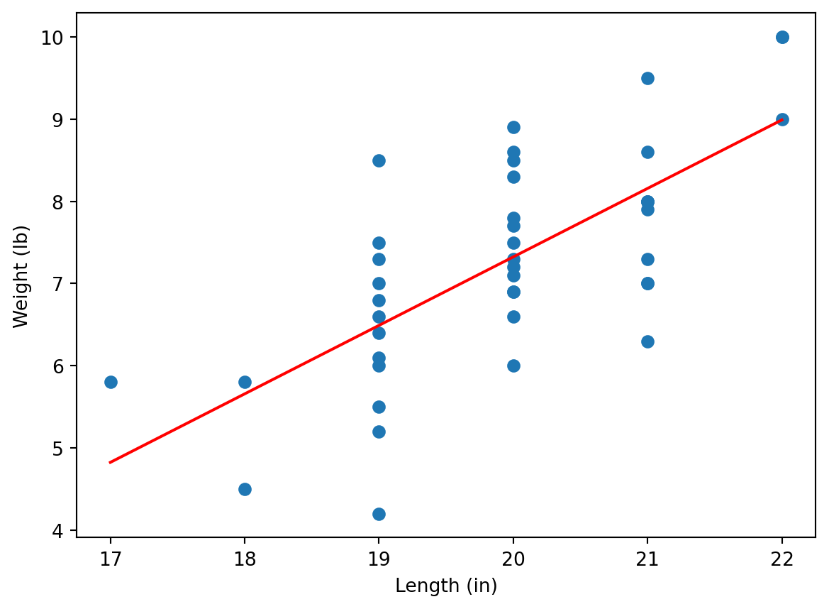 As we can see, the regression line reflects the trend between weights and lengths, however, the values are “jumping” around the line. We could see that the correlation coefficient (see lr.rvalue or r) is not large: