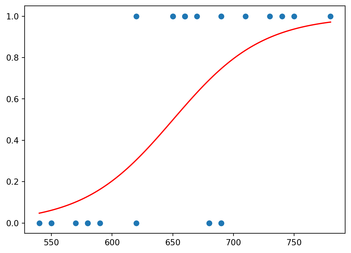 We are going now to plot the scatter plot of admitted vs gmat and plot on the same diagram the curve \(p=p(x_1)\). We will use np.exp function for the exponent.