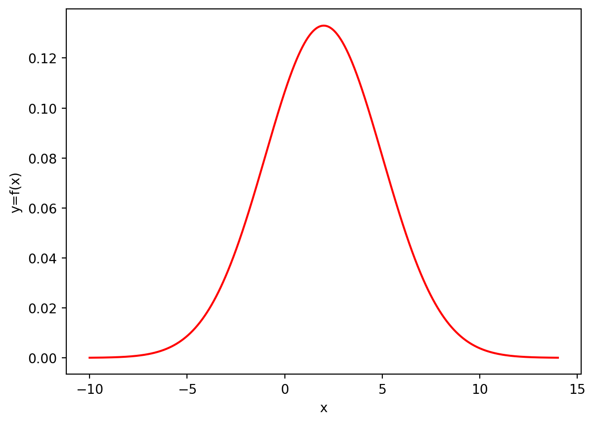 For example, the following code plots the graph of \(f_X(x)\) for \(X\sim \mathcal{N}(2,3^2)\) (on the interval \(x\in(-10,14)\) - for example). The graph is in red colour and the axes are properly labelled.