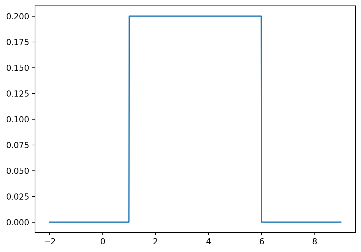 We can also plot the graph of the PDF for \(X\sim U(1,6)\), e.g. we plot it for \(x\in[-2,9]\):