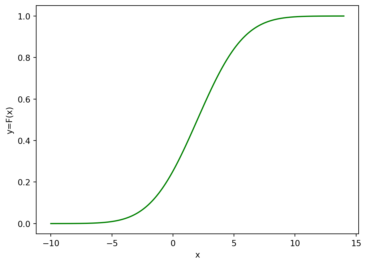 Plot the graph of CDF for \(X\sim \mathcal{N}(2,3^2)\) (also on the interval \(x\in(-10,14)\)). Use green colour and label the axis with \(x\) and \(y=F(x)\).