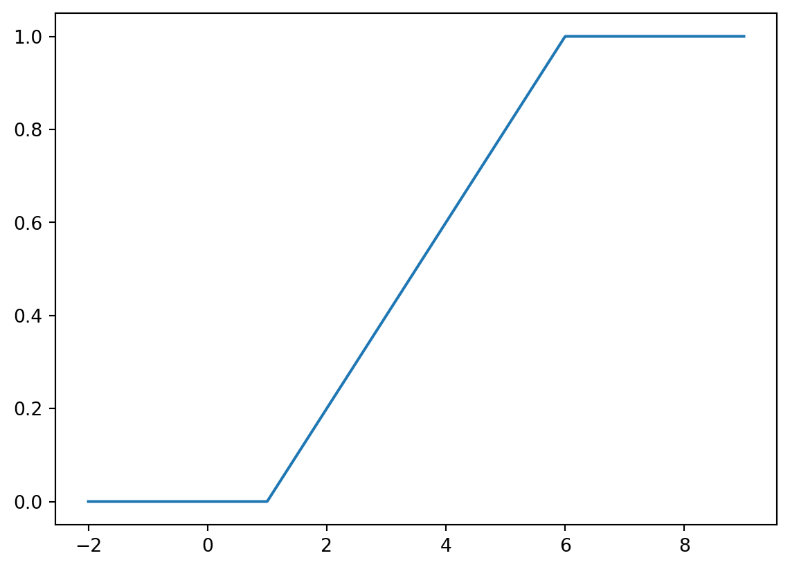 Plot the graph of \(F_X(x)\) for \(X\sim U(1,6)\) on the interval \([-2,9]\). Check the output: