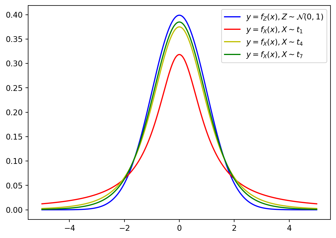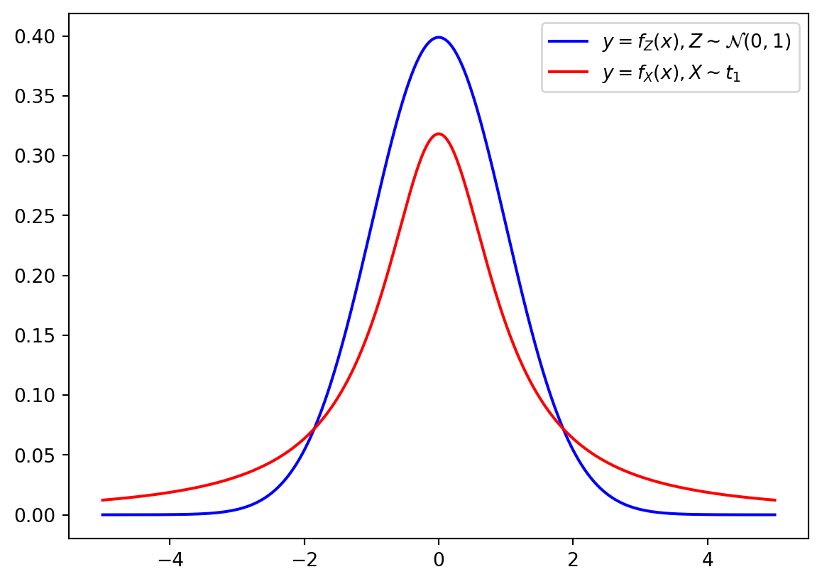 The PDF of \(t\)-distribution has heavier (“thicker”) tails than the standard normal distribution: the following picture compare PDFs for \(Z\sim \mathcal{N}(0,1)\) and \(X\sim t_1\) (the \(t\)-distribution with \(1\) degree of freedom).