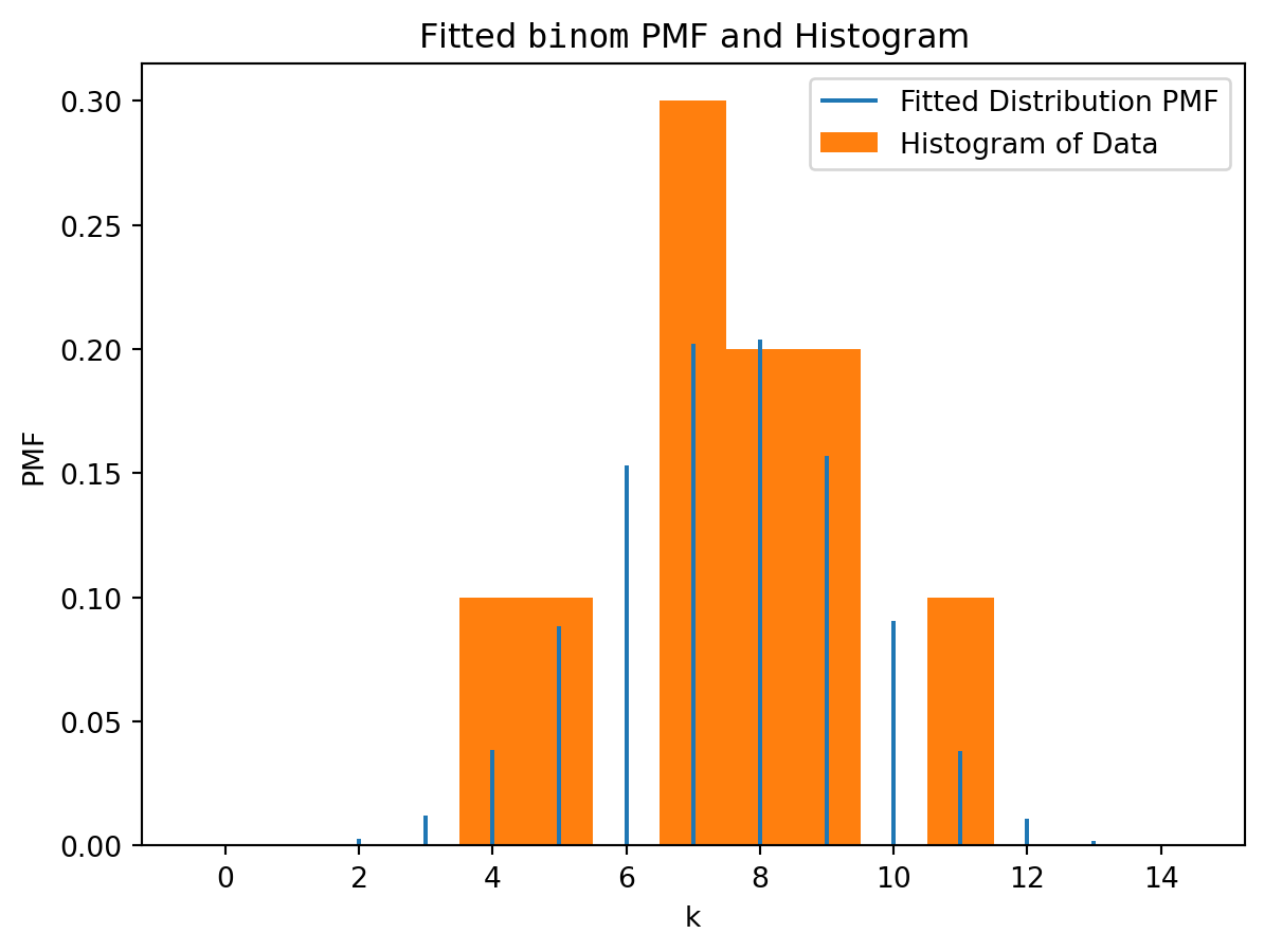 fit(binom, data, bounds) params: FitParams(n=20.0, p=0.37499999389752026, loc=0.0)