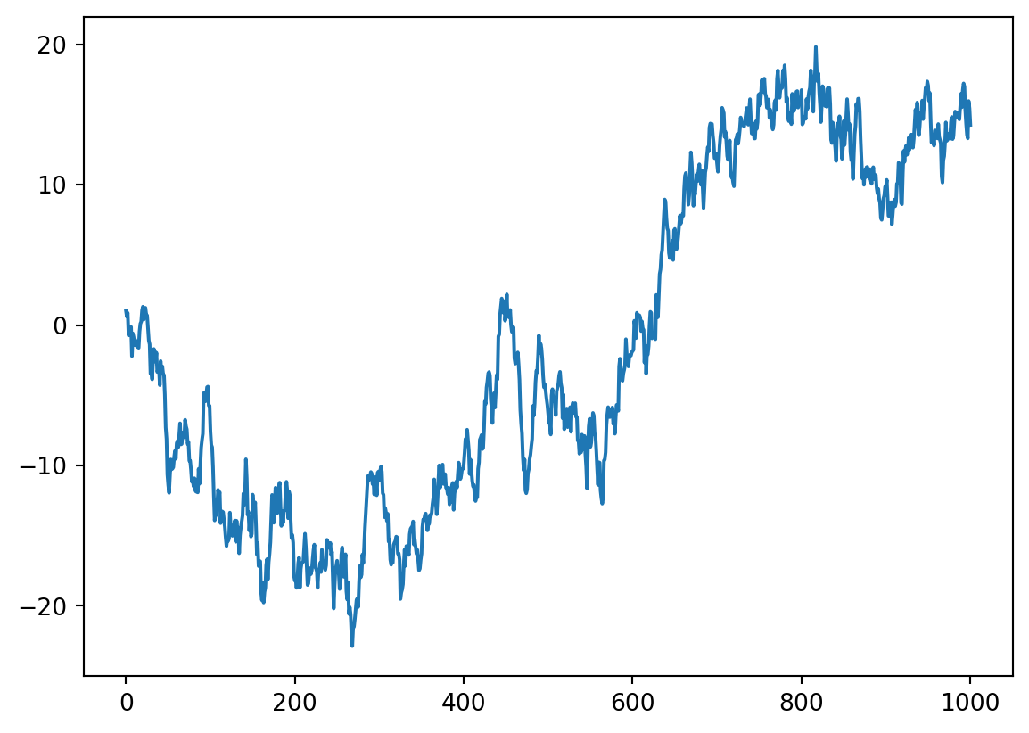 import numpy as npfrom scipy.stats import normimport matplotlib.pyplot as plta =0.999n =1000z = norm.rvs(size = n+1) # If we generate all Z_0, Z_1, ..., Z_n at oncex = np.zeros(n+1) # Numpy array of n+1 zeroesx[0] =1for i inrange(1,n+1): # Recall that the end is not included x[i] = a * x[i-1] + z[i]plt.plot(x)plt.show()