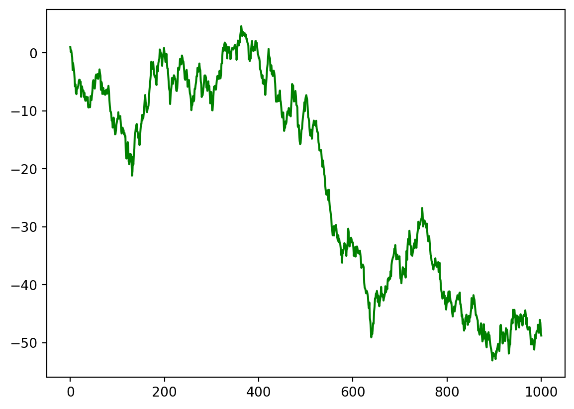 import numpy as npfrom scipy.stats import normimport matplotlib.pyplot as plta =0.999n =1000x = np.zeros(n+1) # Numpy array of n+1 zeroesx[0] =1for i inrange(1,n+1): # Recall that the end is not included x[i] = a * x[i-1] + norm.rvs(size =1)[0] # Generate Z_i on each stepplt.plot(x, color ="green")plt.show()