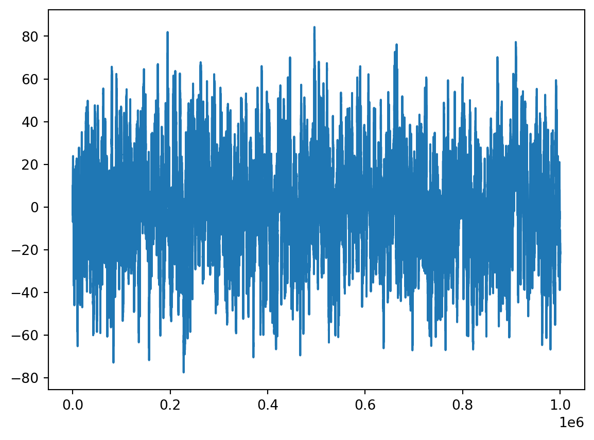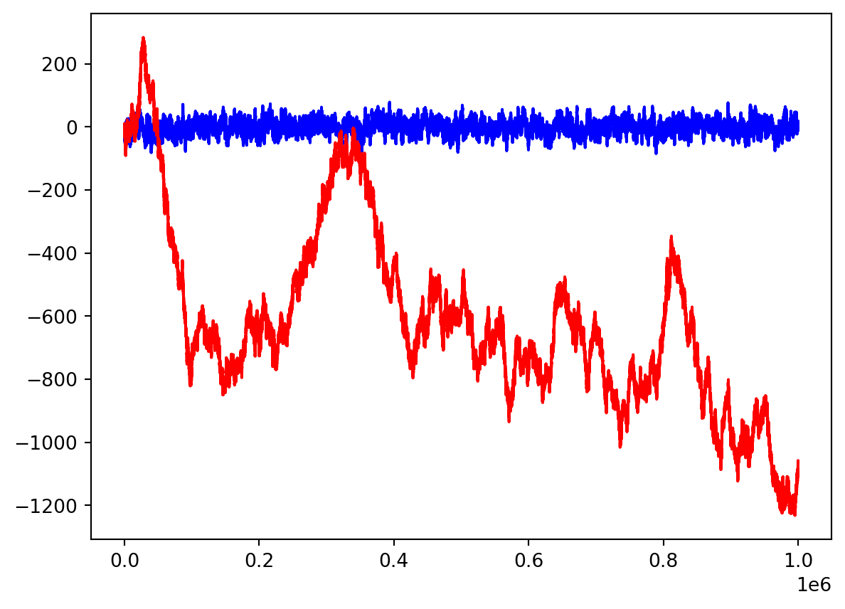 Now generate the first \(10^6\) of the time series \(Y_n= Y_{n-1}+W_n\), where \(\{W_n\}\) is another white noise, \(W_n\sim\mathcal{N}(0,1)\), generated separately from \(\{Z_n\}\). Choose \(Y_0=5\). Store it in y and make two graphs for \(X_n\) and \(Y_n\) on the same plot (by typing two commands plt.plot with one plt.show() at the end). Make them in different colours: blue for x and red for y.