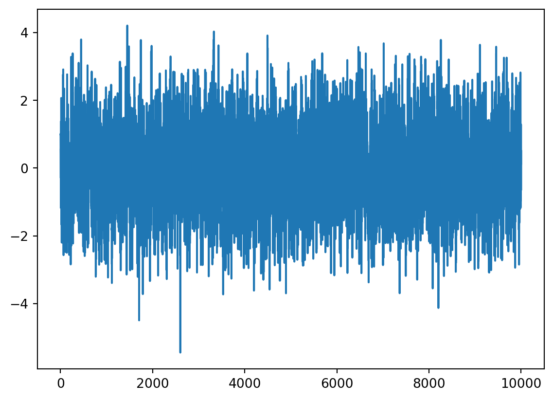Consider the example from a lecture: \(X_n=\frac1{12} X_{n-1}+\frac12 X_{n-2}+Z_n\). Set \(X_0=X_1=1\). Generate \(10^4\) values (note that you should start from \(n=2\)) and assign them to x. Plot the graph of x.