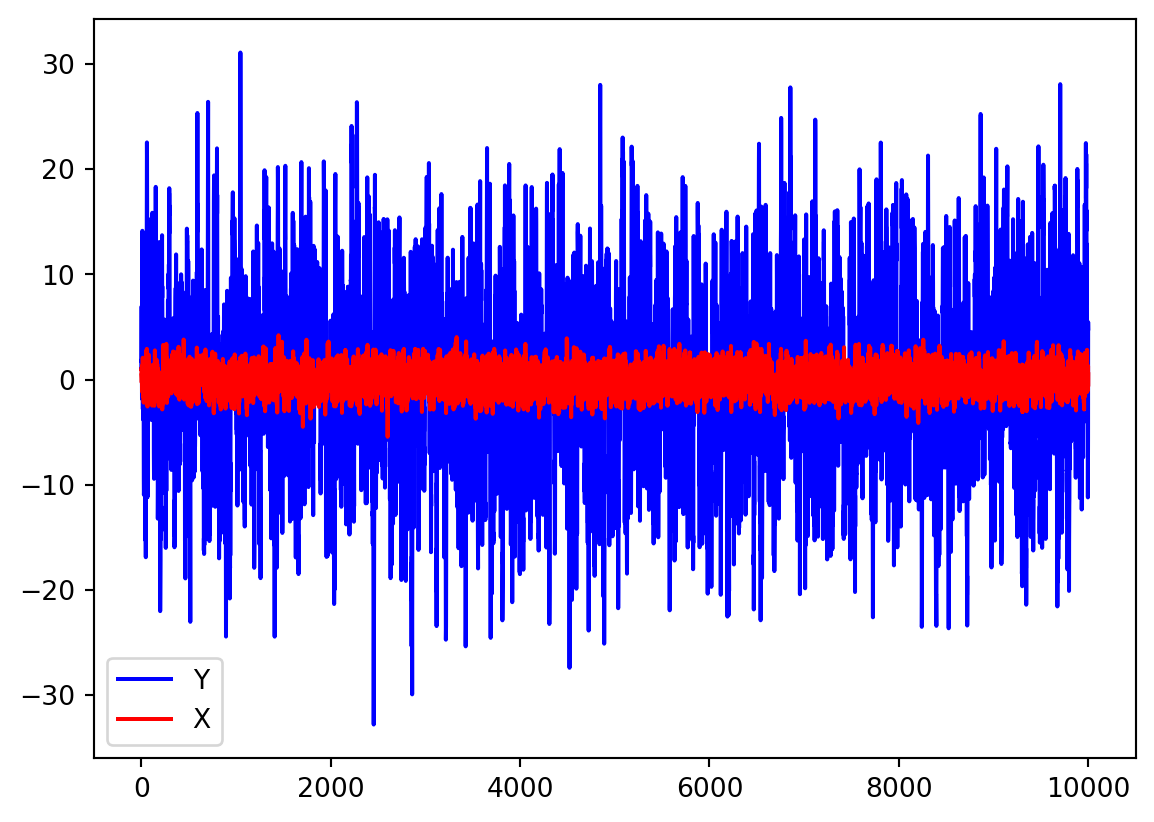 plt.plot(y, color ="blue", label ="Y")plt.plot(x, color ="red", label ="X")plt.legend()plt.show()