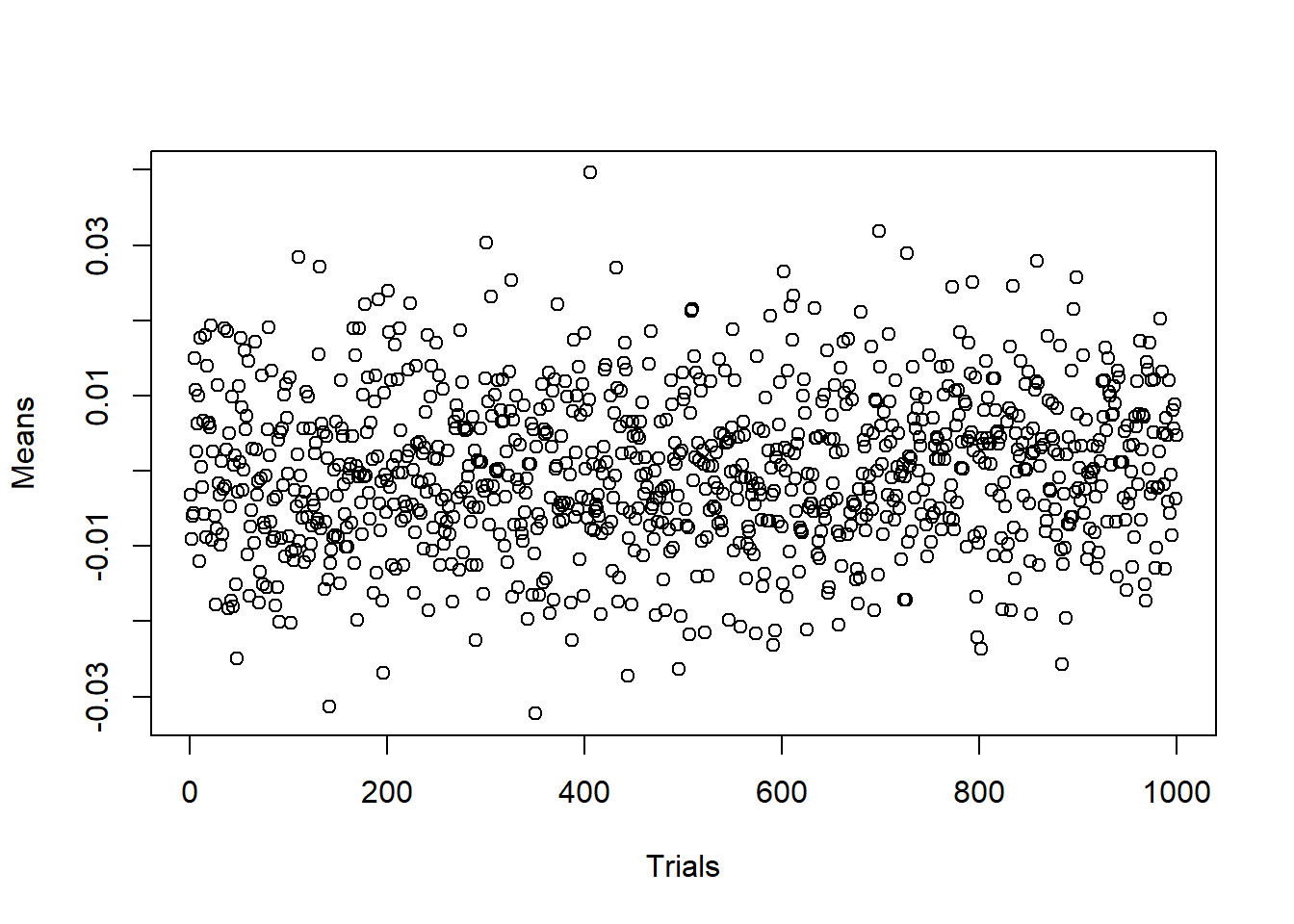 iruns fromi=1toi=10^3,xis a temporary variable which will be rewritten on every iteration of the loopfor, andmean(x)will be assigned to thei-th component of vectormeans. Vectormeanswas created in advance by preallocating zeros to its components.n <- 10**4 # Number of random numbers in each sample m <- 10**3 # Number of samples means <- numeric(m) # Preallocated vector of means for (i in 1:m){ x <- rnorm(n, mean = 0, sd = 1) means[i] <- mean(x) } plot(1:m, means, xlab="Trials", ylab="Means")