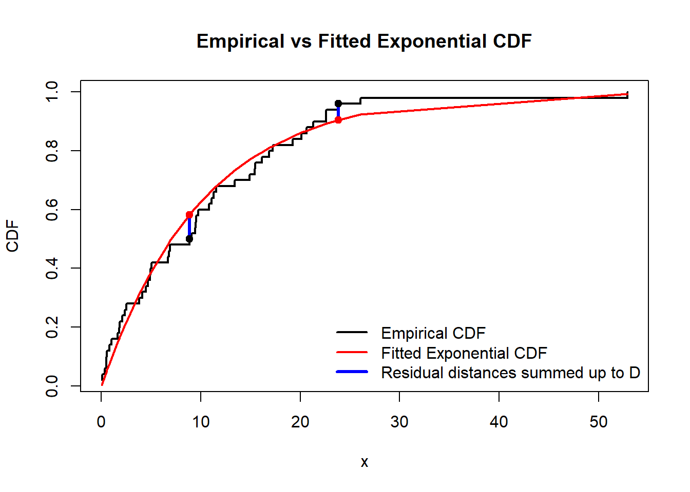 xwas likely different) shows the numberD(sum of absolute values of differences (residual distances) between the theoretical CDF and the CDF which can be calculated from the data, see the graph below), the smaller it is, the better prediction is. And also it shoes the \(p\)-value; in contrary, if \(p\)-value is small (close to \(0\)) it would mean that we have to reject \(H_0\) as then \(p\)-value would be the probability to observe the given data if \(H_0\) were true. Here \(p\)-value is pretty large, so there is no evidences to reject \(H_0\).
