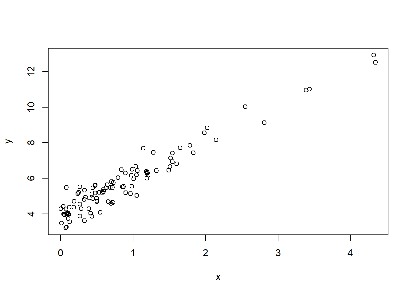plot(df$x, df$y, xlab = "x", ylab = "y")