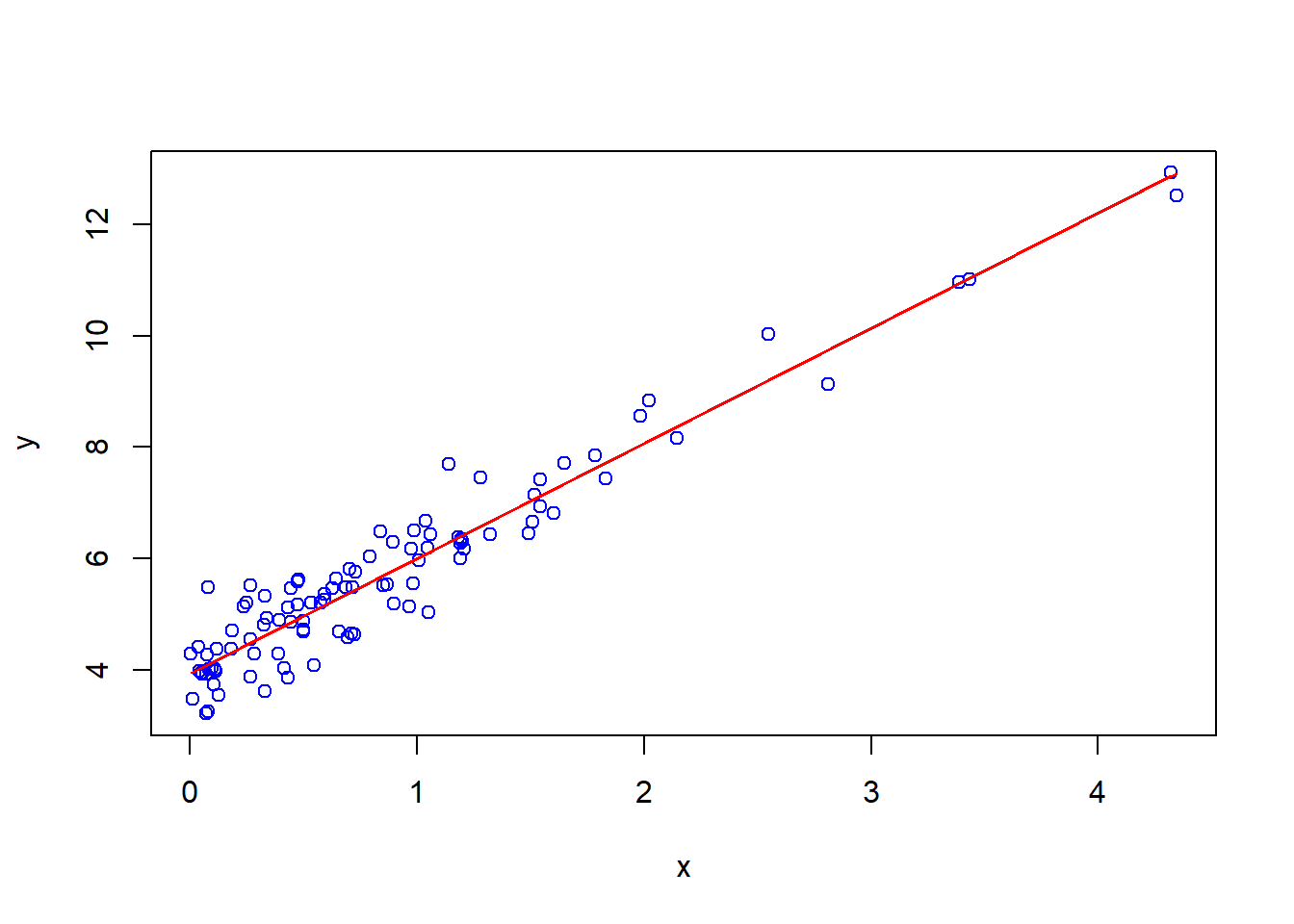 Plot on the same diagram the scatter plot \(y\) against \(x\) as it is shown above, but in blue color, and plot the line \(y=kx+b\) with the found values of \(k\) and \(b\) (do not copy-paste, use coef function) in red colour. (See Lab 3 for plotting two graphs on one diagram).
