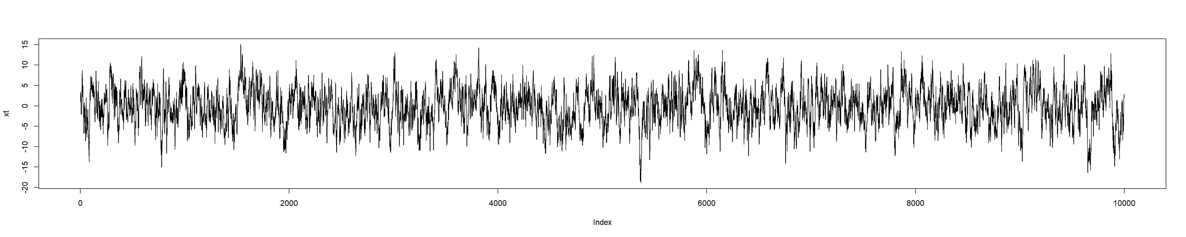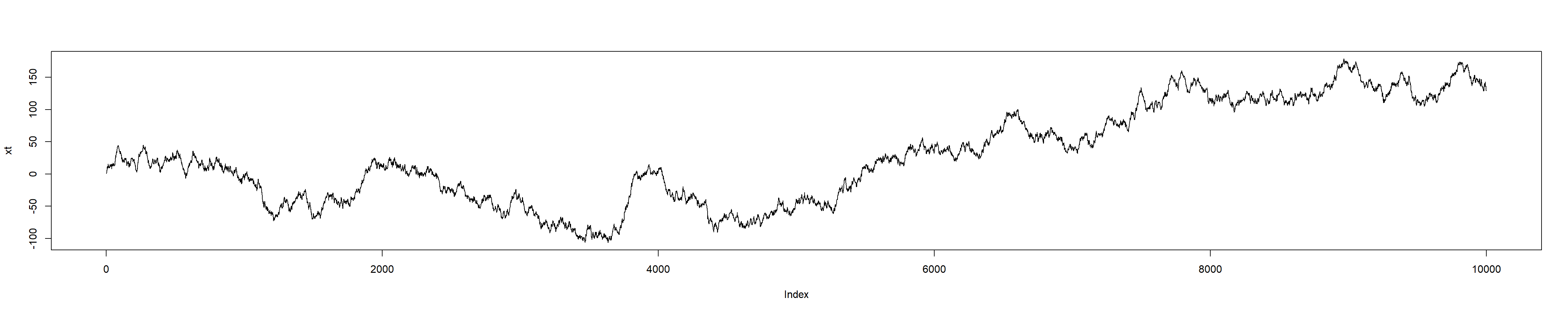 n <-10000xt <-numeric(n) # We pre-allocate zero-values to vector xt of the length nxt[1] <-1et <-rnorm(n,sd=2) # We generate n normally distributed random value # with the standard deviation of sd# Note that rnorm has mean=0 by default, see ?rnormfor (i in2:n){ xt[i] <-0.9*xt[i-1] + et[i]}plot(xt,type="l")