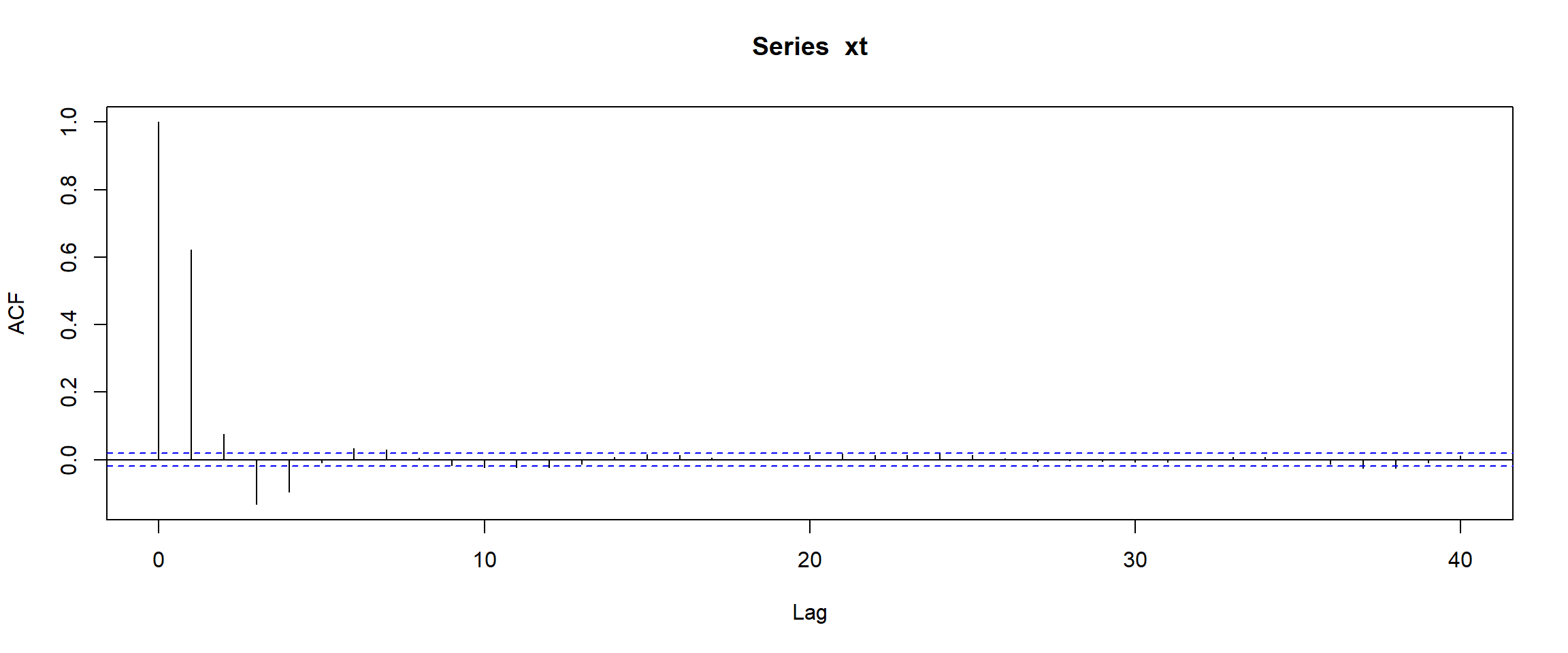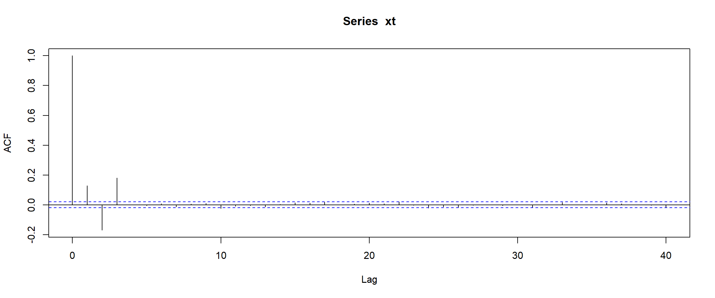 As you can see only the first \(3\) lags (at \(k=1,2,3\)) are not close to zero (and obviously \(k=0\) gives the value \(1\), so the total number of “non-zero” bars is \(4\), but we are looking for bars with \(k>0\)).
