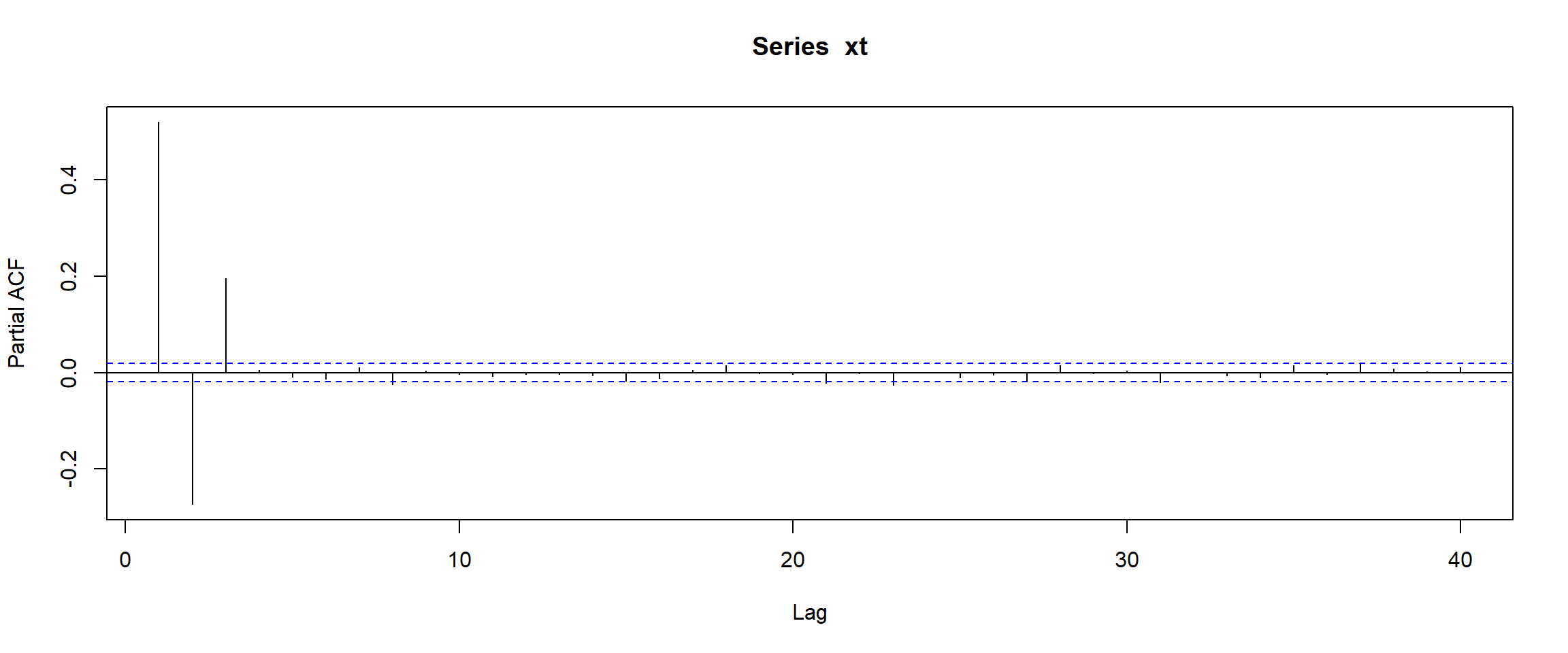 As you can see, PACF effectively vanishes after lag \(3\) (stress that, in contrast to ACF, PACF at \(k=0\) is not defined at all, so here we look at all non-vanishing bars).