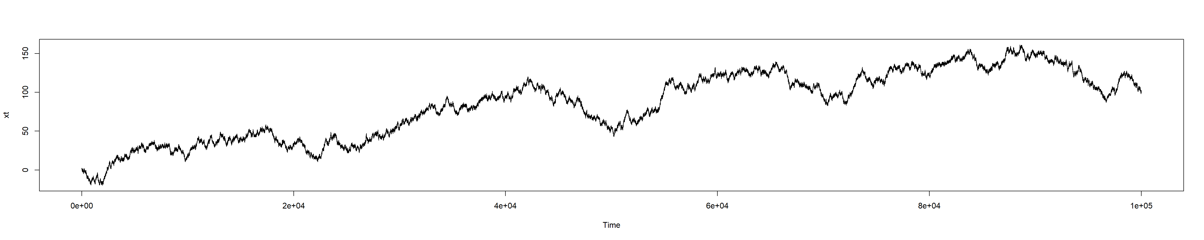 As a result, xt is a usual R-vector. For more sophisticated actions with time series it would be better to convert it to the time series object ts. For this, we use ts function: e.g. xt <- ts(xt), then instead of the last plot-line we can write