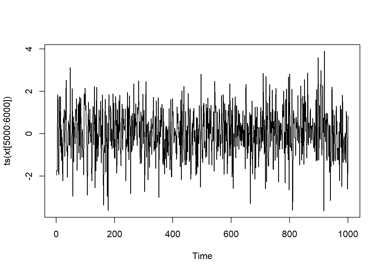 We can also “zoom” the plot, e.g. between \(t=5000\) and \(t=6000\). Note that a slicing xt[n:m] is a vector, and it may be converted to time series: