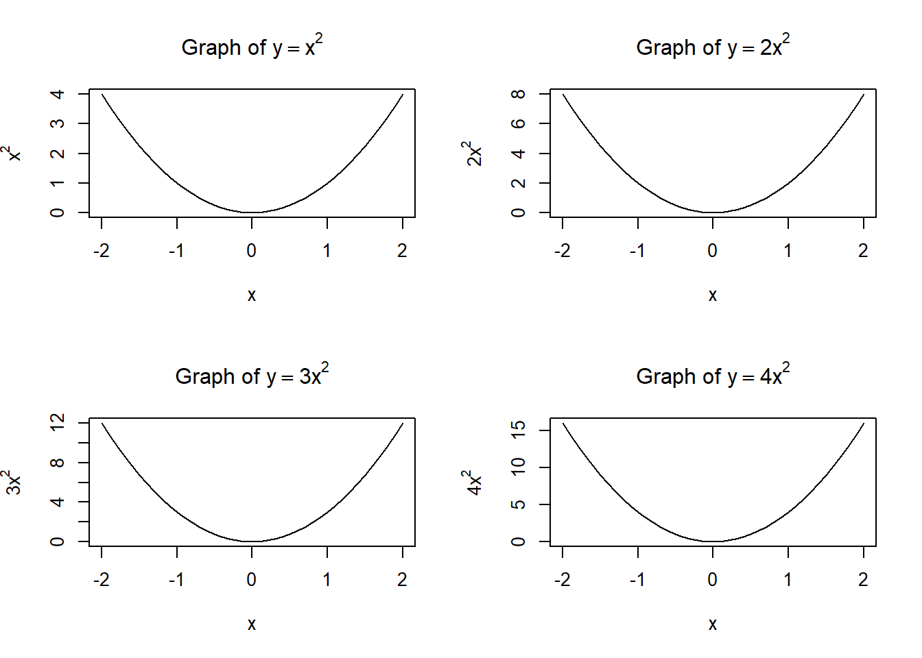 x=seq(-2,2,0.1)par(mfrow =c(2, 2))plot(x, x**2, type="l", main =expression("Graph of "* y==x**2), xlab="x", ylab=expression(x**2))plot(x, 2*x**2, type="l", main =expression("Graph of "* y==2*x**2), xlab="x", ylab=expression(2*x**2))plot(x, 3*x**2, type="l", main =expression("Graph of "* y==3*x**2), xlab="x", ylab=expression(3*x**2))plot(x, 4*x**2, type="l", main =expression("Graph of "* y==4*x**2), xlab="x", ylab=expression(4*x**2))