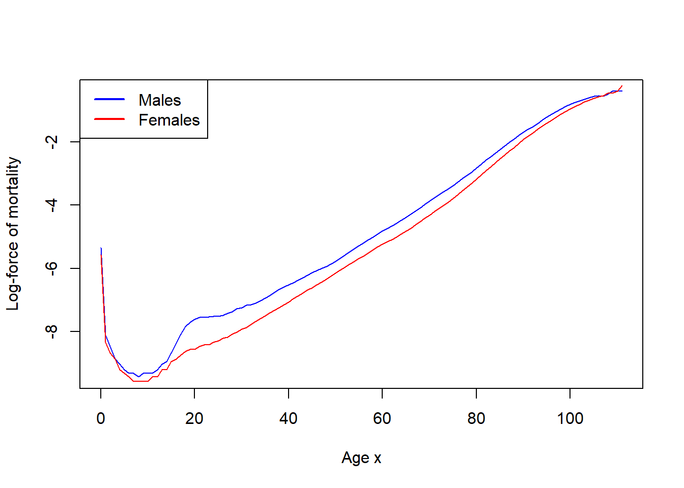 lx_males <- lx_males[1:112]lx_females <- lx_females[1:112]age <- age[1:112]ex_males <- (rev(cumsum(rev(lx_males)))-lx_males)/lx_malesex_females <- (rev(cumsum(rev(lx_females)))-lx_females)/lx_femalesplot(age, age + ex_males, type='l', xlab="Age x",ylab="Total expected lifetime after age x",col='blue')lines(age, age + ex_females, type='l', col='red')legend("topleft",legend =c("Males", "Females"),lwd =2, lty =c(1, 1), col=c("blue","red"))