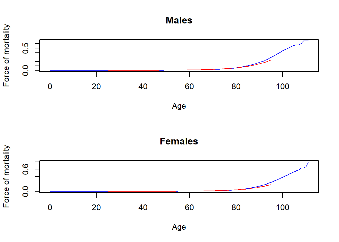 par(mfrow =c(2, 1))plot(age, mux_males, type="l", col="blue", xlab="Age", ylab="Force of mortality", main="Males")lines(25:95, b_male * c_male**(25:95), col ="red")plot(age, mux_females, type="l", col="blue", xlab="Age", ylab="Force of mortality", main="Females")lines(25:95, b_female * c_female**(25:95), col ="red")