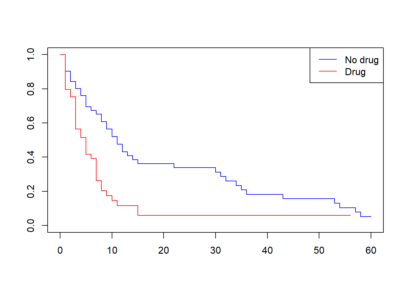 kmdrugCall: survfit(formula = sf ~ df$drug)