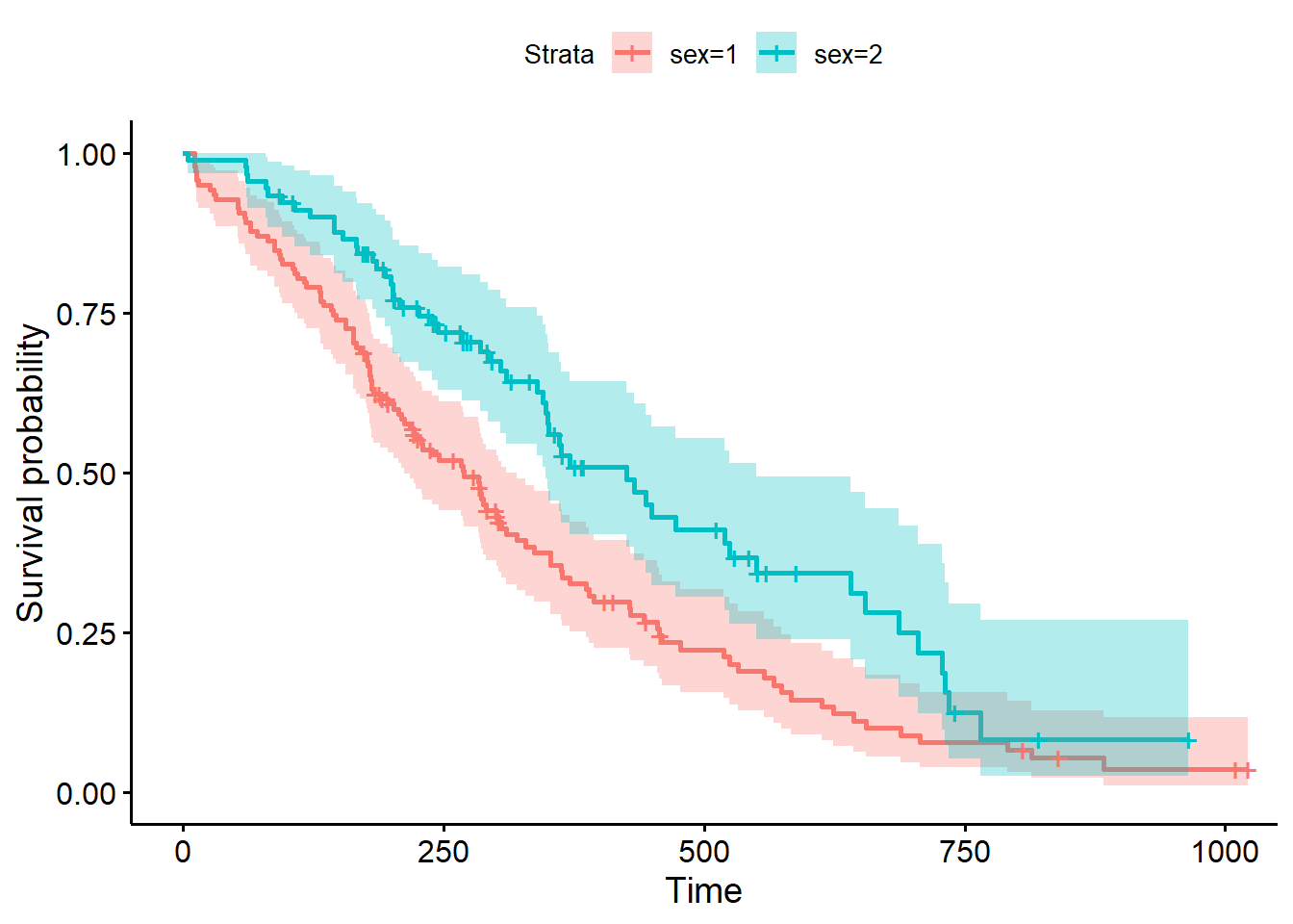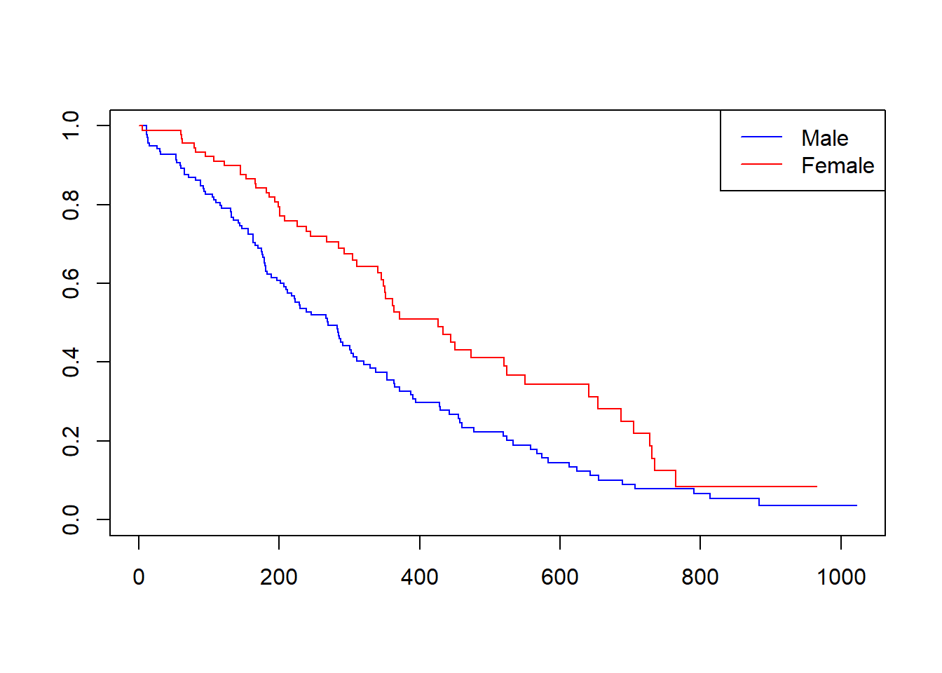 kmlung <- survfit(Surv(time, status == 2) ~ sex, data = lung)